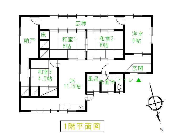 ・南北に長めの敷地に木造瓦葺き平家建で4DKのコンパクトな住宅があり、北側には広い舗装された駐車場もあり日々の管理がしやすそうです。