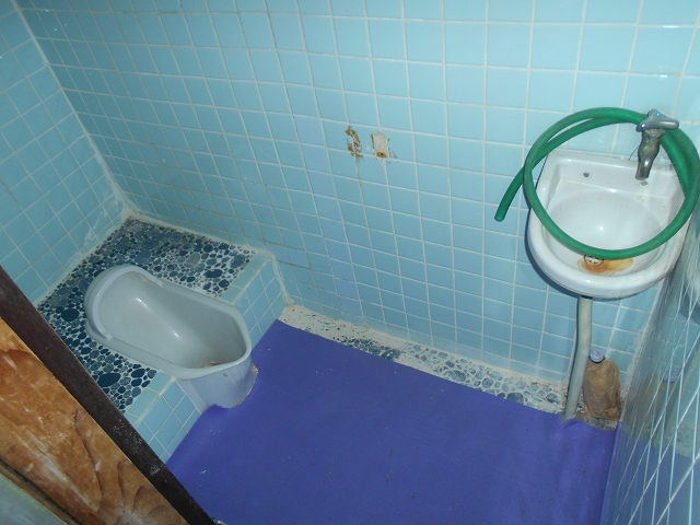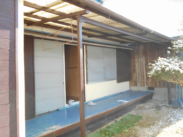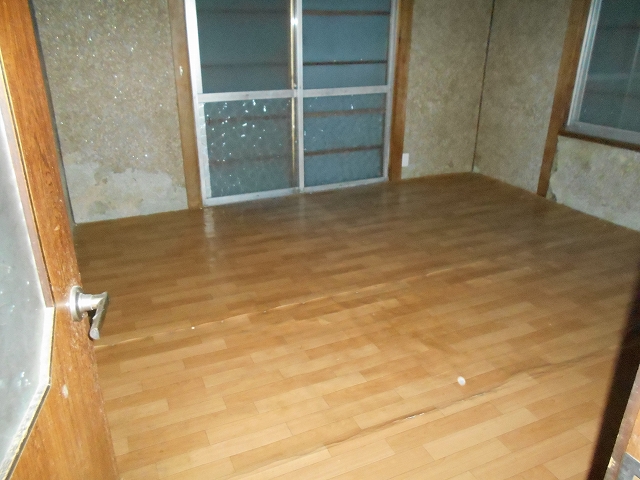 ・古い住宅(玄関側)の床はすべてふかふかした状態、壁も劣化が目立ち一部で雨漏りも見られます。また洋室1は元のDKでキッチンを撤去したままです。増築部分は壁に少し劣化がある程度の状況です。設備では古い建物側の風呂・洗面所に傷みがあり、古いトイレは汲み取り式のため使用不可です。外部でも古い建物側の雨戸に傷みがあり、屋根金属板の塗装に劣化が見られます。