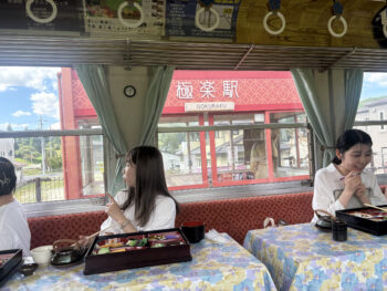 ちゃんとアテンダントの方が、明知鉄道沿線の見どころを案内してくれるので、食事と車窓風景、どちらも楽しむことができました。