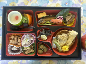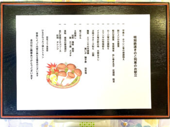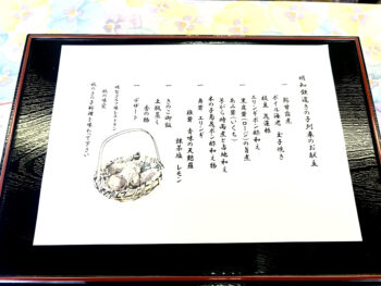ちなみに、この日は特別に、3店舗のお弁当が提供され、私は、「明智ゴルフ場レストラン」のお弁当をいただくことになりました。懐石料理のような献立表を見ながら、どんなお料理と対面するのかワクワク!期待が高まります。
