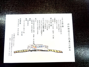 それに加え、昭和62年に、初の料理列車として地元の特産品を使ったヘルシートレイン(寒天列車)が運行され、現在は、おばあちゃんのお弁当列車、寒天列車、冷酒列車、きのこ列車、じねんじょ列車、枡酒列車など、季節に応じてさまざまなグルメ列車が運行されています。