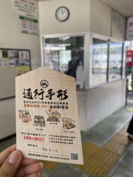 この通行手形は、1日フリー乗車券と、いろいろな施設の割引が付いているお得な手形。沿線の岩村歴史資料館や日本大正村などで割引が利用できるようになっていました。