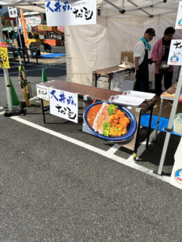 恵那の観光ブースでは、恵那の栗菓子や、岩村藩出身の早矢仕有的(はやし ゆうてき)が考案されたとされる、えなハヤシ(ハヤシライス)などの観光に関した食と、限定30食の「大井ダムえなハヤシ」も販売されていました。