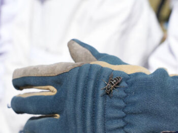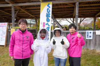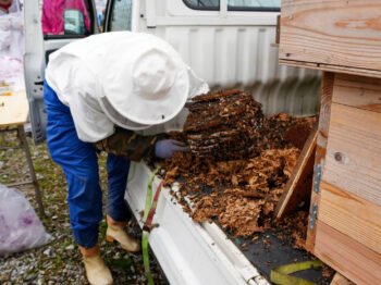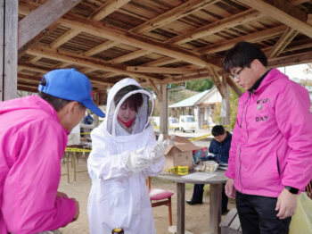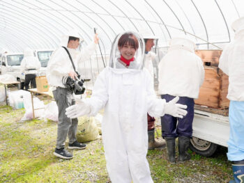 見物していたハウスの外にもハチが飛んできて叫びそうになりましたが、よほど刺激をしなければ刺さないと聞いて静かに様子を見守っていたところ、防護服を身にまとった恵那市地域おこし協力隊の下川将さんが登場。
