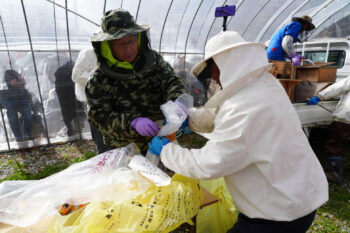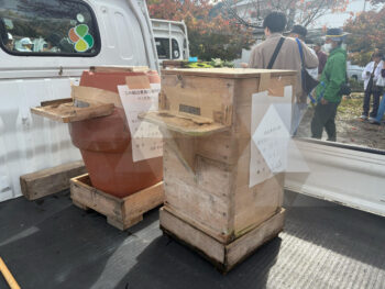 開会式が終わり、いよいよビニールハウス内で巣の取り出しがスタート。ハウスの外には、巣箱を積んだ軽トラックが所狭しと並び、順番に中に入っていきます。