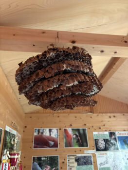 自らヘボのいる所に入っていくなんて怖くて足が震えましたが、不思議なことにハウスの中に入ると完全防備であることもあって、それほど怖さはなく、それよりもヘボの巣を間近に見ることができて大興奮。
