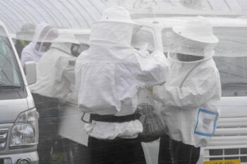 ビニールハウスの中では、防護服のスタッフがスタンバイ。