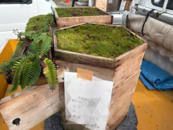 開会式が終わり、いよいよビニールハウス内で巣の取り出しがスタート。ハウスの外には、巣箱を積んだ軽トラックが所狭しと並び、順番に中に入っていきます。