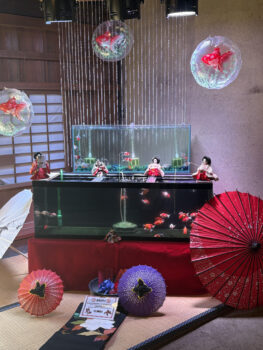 水槽の中をゆったりと泳ぐ色とりどりの金魚と、その周りに飾られたおひなさま。水の揺らぎとともに光が反射し、きらきらと輝く様子はとても美しく、思わず見入ってしまいます。